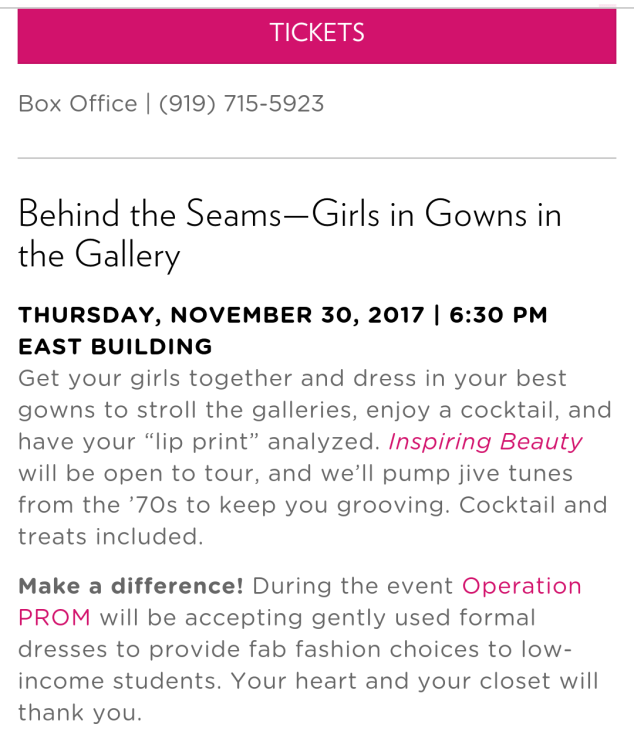 Grab your girls and get ready to twirl in your best gowns on Thursday, November 30 at 6:30 pm in the East Building for a special event~ “Behind the Seams–Girls in Gowns in the Gallery”. You’ll have a chance to stroll the galleries, enjoy a cocktail, have your lip print analyzed, tour Inspiring Beauty and much more! . Cocktail and treats included. Event ends at 9pm.